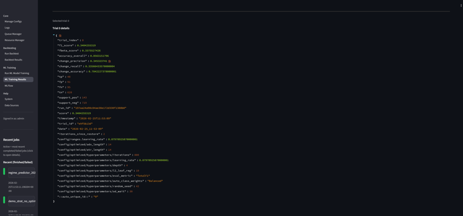 Our platform supports traditional rule-based systems as well as the integration and training of machine learning models — including neural networks and advanced predictive pipelines — when your strategy design calls for it. Optimization is driven by systematic hyperparameter search techniques (leveraging Optuna search algorithms on distributed Ray Tune infrastructure), enabling efficient exploration of parameter space with a strong emphasis on out-of-sample robustness.