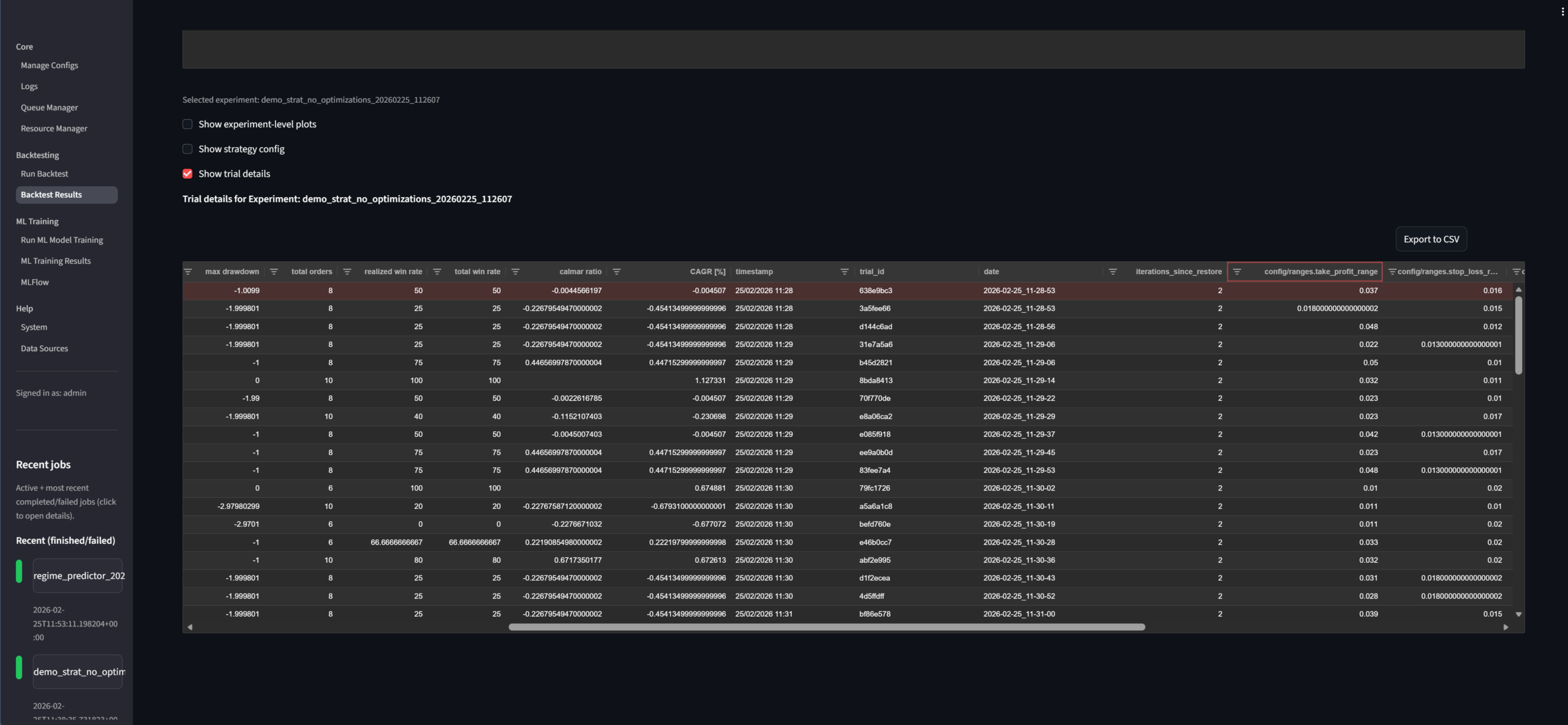 Trials can be reviewed in a sortable table, allowing you to assess performance across a wide range of metrics — including return characteristics, risk statistics, win rates, drawdowns, parameter values, and timestamps — all in one place.