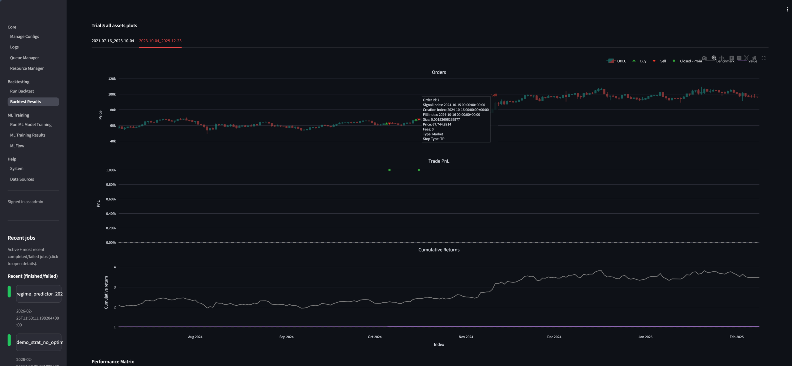 Cumulative returns, per-trade performance, and supporting metrics are displayed alongside execution markers, creating a direct link between strategy logic and real outcomes.